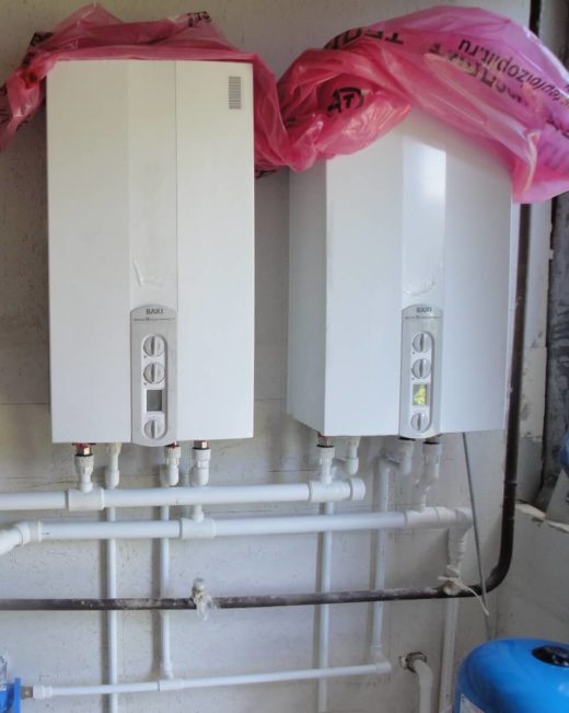 Но что есть — то есть. Смонтировали два котла в общий коллектор (т.е. они работают параллельно, как правило работает один котёл, в мороз — подключается второй). И по горячей воде сделали возможным параллельное подключение обоих. Второй обычно работает в «летнем режиме», т.е. подключается только для нагрева горячей воды.